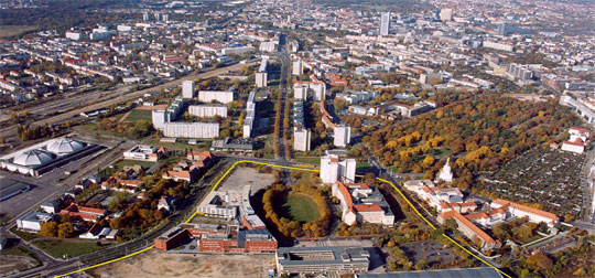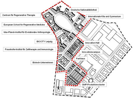 Emanated from a cooperative planning, implementation and learning process of the German cities Bremen, Leipzig and Nürnberg (www.koopstadt.de), which became part of the National Urban Development Policy, the BioCity Campus project became a model project of the same strategic policy. The project development scheme is being elaborated by UrbanPlan in cooperation with the Fraunhofer Society. The project’s goal is the exemplary advancement of the forming of dynamic new technology fields (in this case the regenerative medicine) by spatial concentration of innovative high-technology components. In this context the BioCity Campus should become an identification and communication location for technology components and their cooperants as well as an information and learning location for the public. Because of this reason the use components of the BioCity Campus shall not be restricted to the conventional science and research institutions and hightech companies. “Garage shops” for start-up companies and for specialised craftsmen, an “innovation hall” as showcase of the biotechnology, an international kindergarten and a natural science based highschool shall also be part of the BioCity Campus project and thus shall create synergetic linkages to a multiplicity of local and regional actors.
